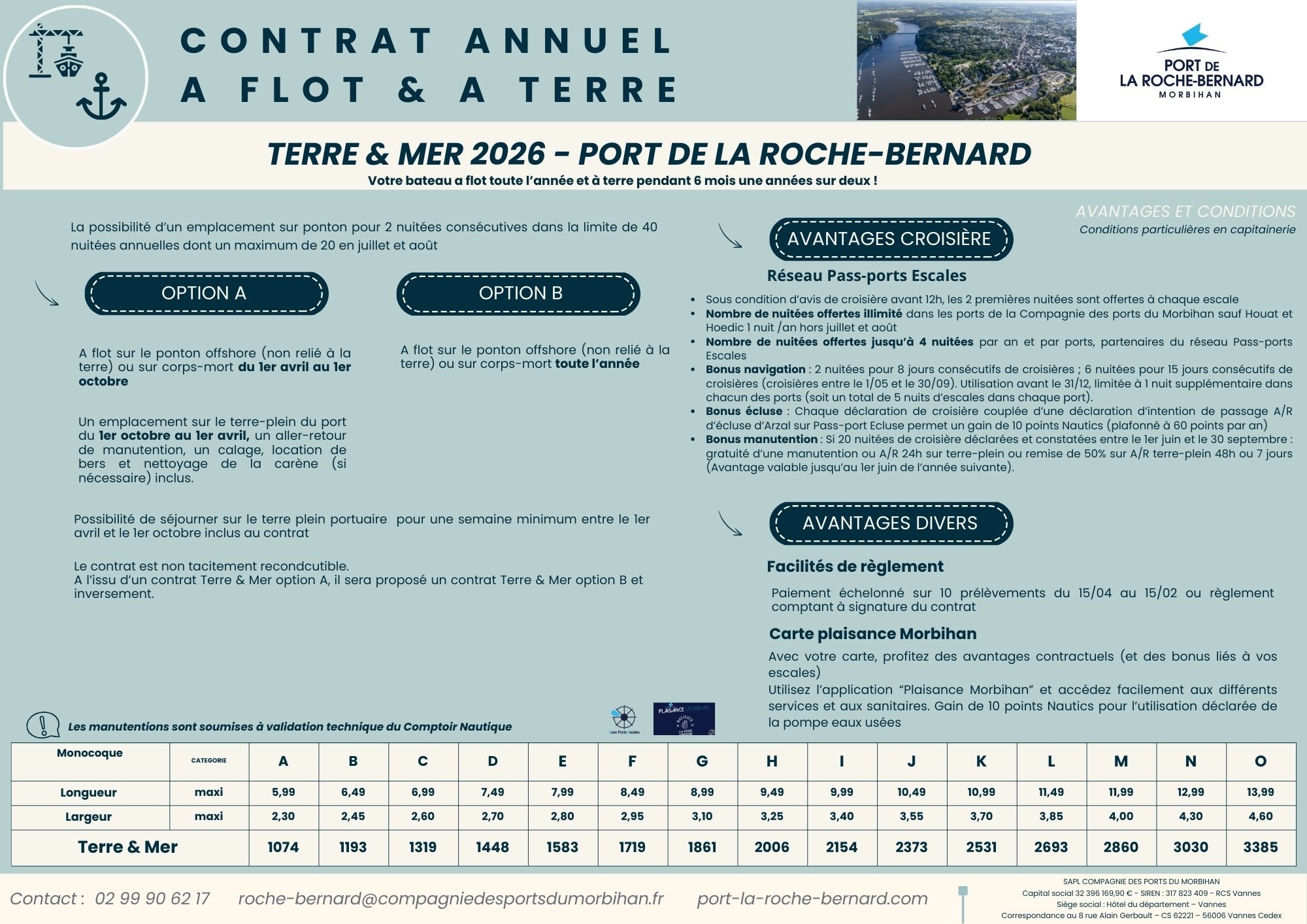 INFORMATION : OFFRE LIMITEE AU TIRANT D'EAU INFERIEUR OU EGAL A 1.80 METRES / SI LE TIRANT D'EAU EST SUPERIEUR A 1.80 METRES, MERCI DE CONTACTER  DIRECTEMENT LA CAPITAINERIE  PAR TELEPHONE AU 02 99 90 62 17 OU PAR MAIL : roche-bernard@compagniedesportsdumorbihan.fr